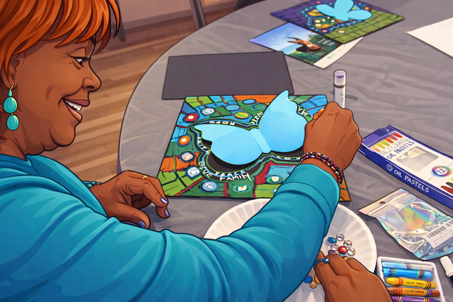 At Supportive Optimistic Sisterhood (S.O.S.), we provide art therapy/therapeutic art group experiences that include all necessary art supplies. The Host Partner provides a space for the service(s), including a water source, tables, table covers and chairs for everyone.